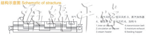 物料由加料器均勻地鋪在網(wǎng)帶上,網(wǎng)帶一般采用12-60目不銹鋼絲網(wǎng),由傳動(dòng)裝置拖動(dòng)在干燥機(jī)內(nèi)移動(dòng)。干燥機(jī)由若干單元組成,每一單元熱風(fēng)獨(dú)立循環(huán),部分尾氣由專門排濕風(fēng)機(jī)排出,廢氣由調(diào)節(jié)閥控制,熱氣由下往上或由上往下穿過鋪滿物料的網(wǎng)帶完成熱量與質(zhì)量傳遞的進(jìn)程,帶走物料水份。網(wǎng)帶緩慢移動(dòng),運(yùn)行速度可根據(jù)物料溫度自由調(diào)節(jié),干燥后的成品連續(xù)落入收料器中。上下循環(huán)單元根據(jù)用戶需要可靈活配備,單元數(shù)量亦可根據(jù)需要選取。