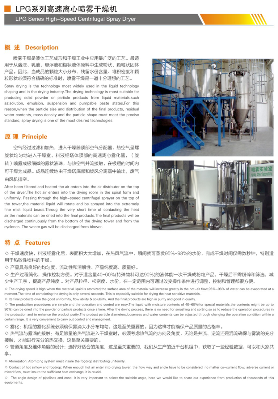 LPG系列離心式噴霧干燥機系氣液兩相并流式干燥設備,采用高速離心式霧化器,將料液霧化成微細的霧滴,與經(jīng)分布器分布后的熱空氣在干燥塔內混合,迅速進行熱質交換,在極短的時間內干燥成為粉狀產品。生產控制和產品質量控制方便可靠,廣泛應用于不同種類液體物料的干燥生產。