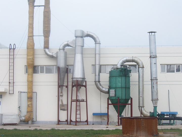 的復雜熱交換過程,最終達到產品的干燥要求。通過干燥管后的氣固混合物,先經旋風分離器回收物料,再經布袋除塵器分離粉末(500目以下