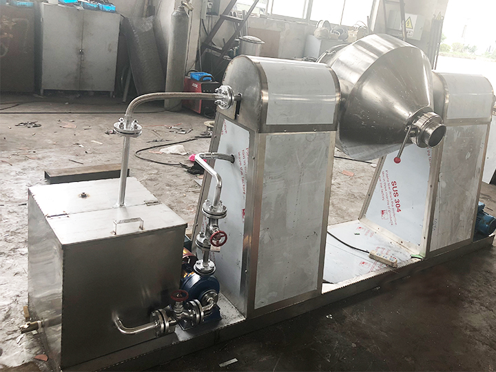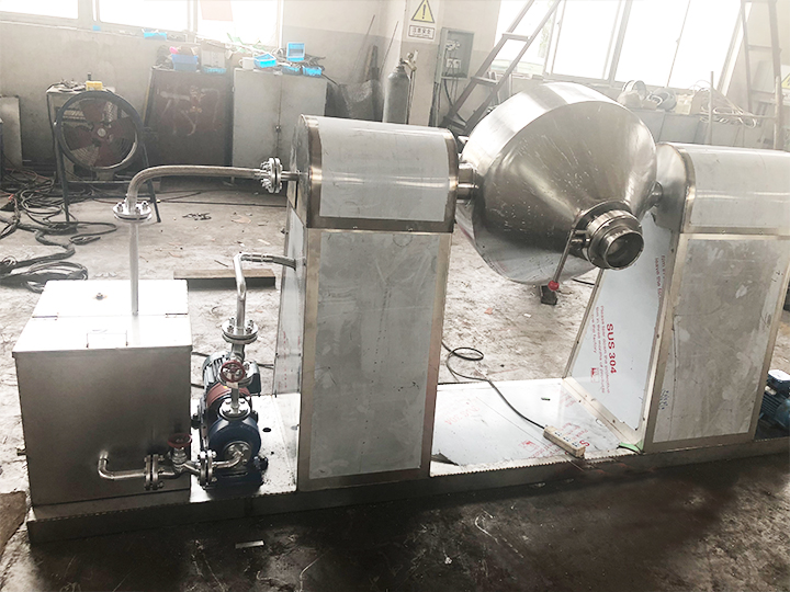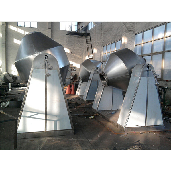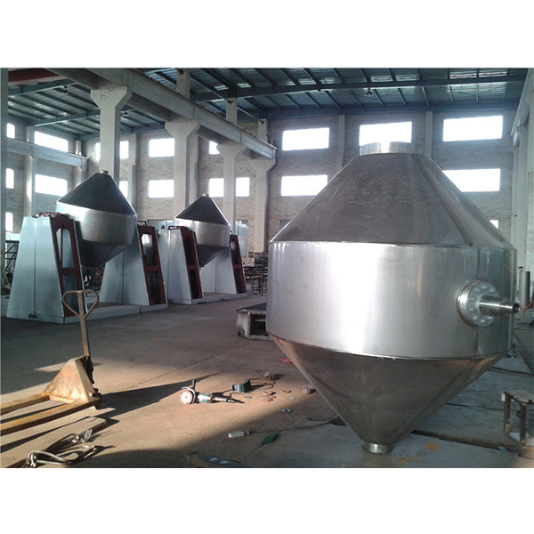 雙錐回轉(zhuǎn)真空干燥機為雙錐形的回轉(zhuǎn)罐體,罐內(nèi)在真空狀態(tài)下,向夾套內(nèi)通入蒸汽或熱水進行加熱,熱量通過罐體內(nèi)壁與濕物料接觸,濕物料吸熱后蒸發(fā)的水汽,通過真空泵經(jīng)真空排氣管被抽走。由于罐體內(nèi)處于真空狀態(tài),且罐體的回轉(zhuǎn)使物料不斷的上下內(nèi)外翻動,故加快了物料的干燥速度,提高干燥效率,達到均勻干燥的目的。雙錐回轉(zhuǎn)真空干燥機系統(tǒng)主要由雙錐回轉(zhuǎn)真空干燥機、冷凝器、除塵器、真空抽氣系統(tǒng)、加熱系統(tǒng)、冷卻系統(tǒng)、電控系統(tǒng)等組成。