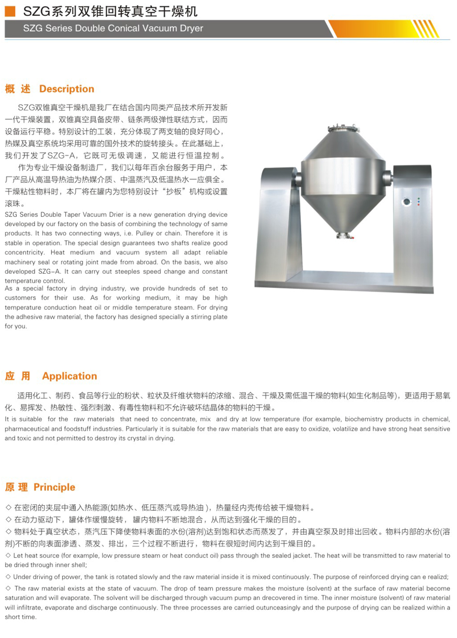 在密閉的夾層中通入熱能源(熱水、低壓蒸汽或?qū)嵊?,熱量經(jīng)內(nèi)殼傳給被干燥物料。在動力驅(qū)動下,罐體作緩慢旋轉(zhuǎn),罐內(nèi)物料不斷地翻動、混合,從器壁內(nèi)表面接受熱量,從而達到強化干燥的目的。物料處于真空狀態(tài),蒸汽壓下降使物料表面的水份(溶劑)達到飽和狀態(tài)而蒸發(fā)了,并由真空泵及時排出回收。物料內(nèi)部的水分(溶劑)不斷地向表面滲透、蒸發(fā)、排出,三個過程不斷進行,物料在短時間內(nèi)達到干燥目的。