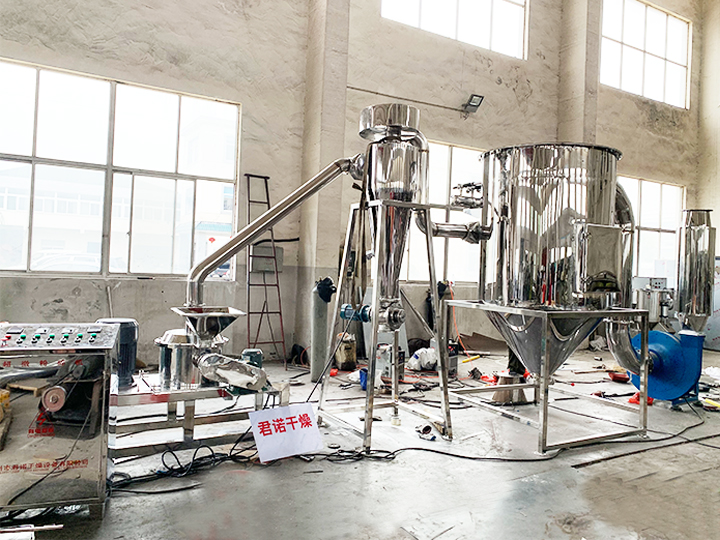 物料通過(guò)投料口進(jìn)入柱形粉碎室,被沿著研磨軌做圓周運(yùn)動(dòng)的研磨輪碾壓、剪切而實(shí)現(xiàn)粉碎。被粉碎的物料通過(guò)風(fēng)機(jī)引起的負(fù)壓氣流帶出粉碎室,進(jìn)入物料收集系統(tǒng),經(jīng)過(guò)濾袋過(guò)濾,空氣被排出,物料、粉塵被收集,完成粉碎。