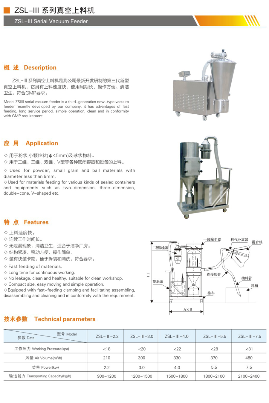 產品概述ZSL系列真空上料機是我公司最新開發(fā)研制的第三代新型真空上料機,它具有上料速度快、用周期長、操作方便、清潔衛(wèi)生,符合“GMP”要求。